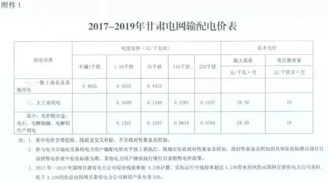 1、2017-2019年甘肅電網輸配電價表