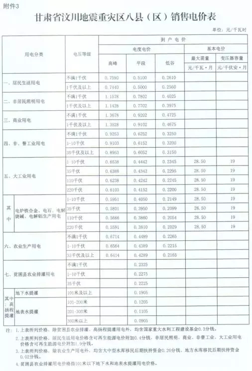 3、甘肅省汶川地震重災區(qū)八縣(區(qū))銷售電價表