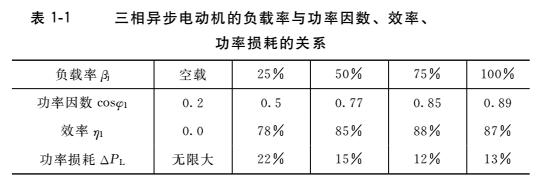 三相異步電動機的負載率與功率因數(shù)、效率、功率損耗的關系見表1-1。