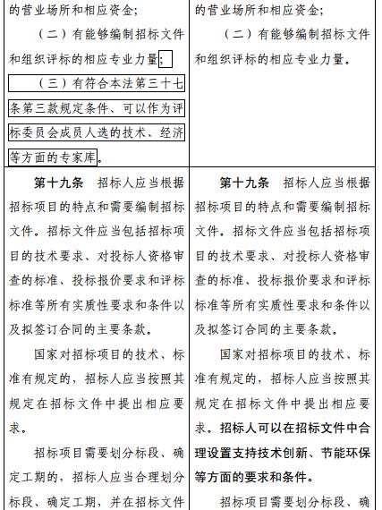 四、將第十九條第二款修改為:“國家對招標項目的技術、標準有規(guī)定的,招標人應當按照其規(guī)定在招標文件中提出相應要求。招標人可以在招標文件中合理設置支持技術創(chuàng)新、節(jié)能環(huán)保等方面的要求和條件?!?/p>
