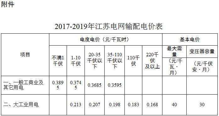 按照國家發(fā)展改革委輸配電價(jià)改革統(tǒng)一部署,現(xiàn)將江蘇電網(wǎng)2017-2019年輸配電價(jià)及有關(guān)事項(xiàng)通知如下: