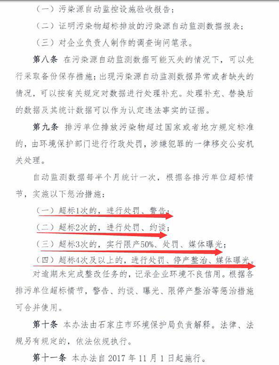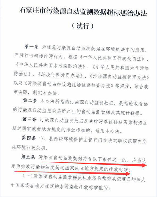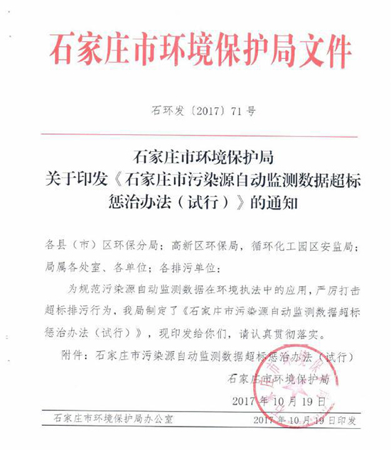 近日河北石家莊市環(huán)保局印發(fā)《石家莊市污染源自動監(jiān)測數據超標懲治辦法(試行)》(以下簡稱“辦法”)。辦法明確,企業(yè)污染源自動監(jiān)測數據出現(xiàn)超標將被處罰,超標4次及以上,將停產整治。辦法自11月1日起施行。