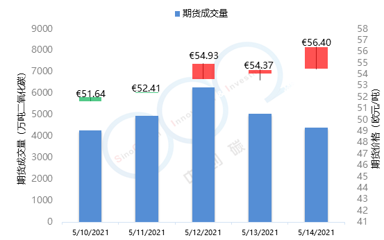• 2021年5月10日至5月14日,由于歐盟碳市場投資者的強(qiáng)勢買盤以及歐盟氣候負(fù)責(zé)人對于歐盟碳價較為消極的干預(yù)政策,歐盟碳價在本周再次呈現(xiàn)較大漲幅并接連刷新記錄,由51.64歐元/噸上漲至56.40歐元/噸,漲幅達(dá)9.22%。