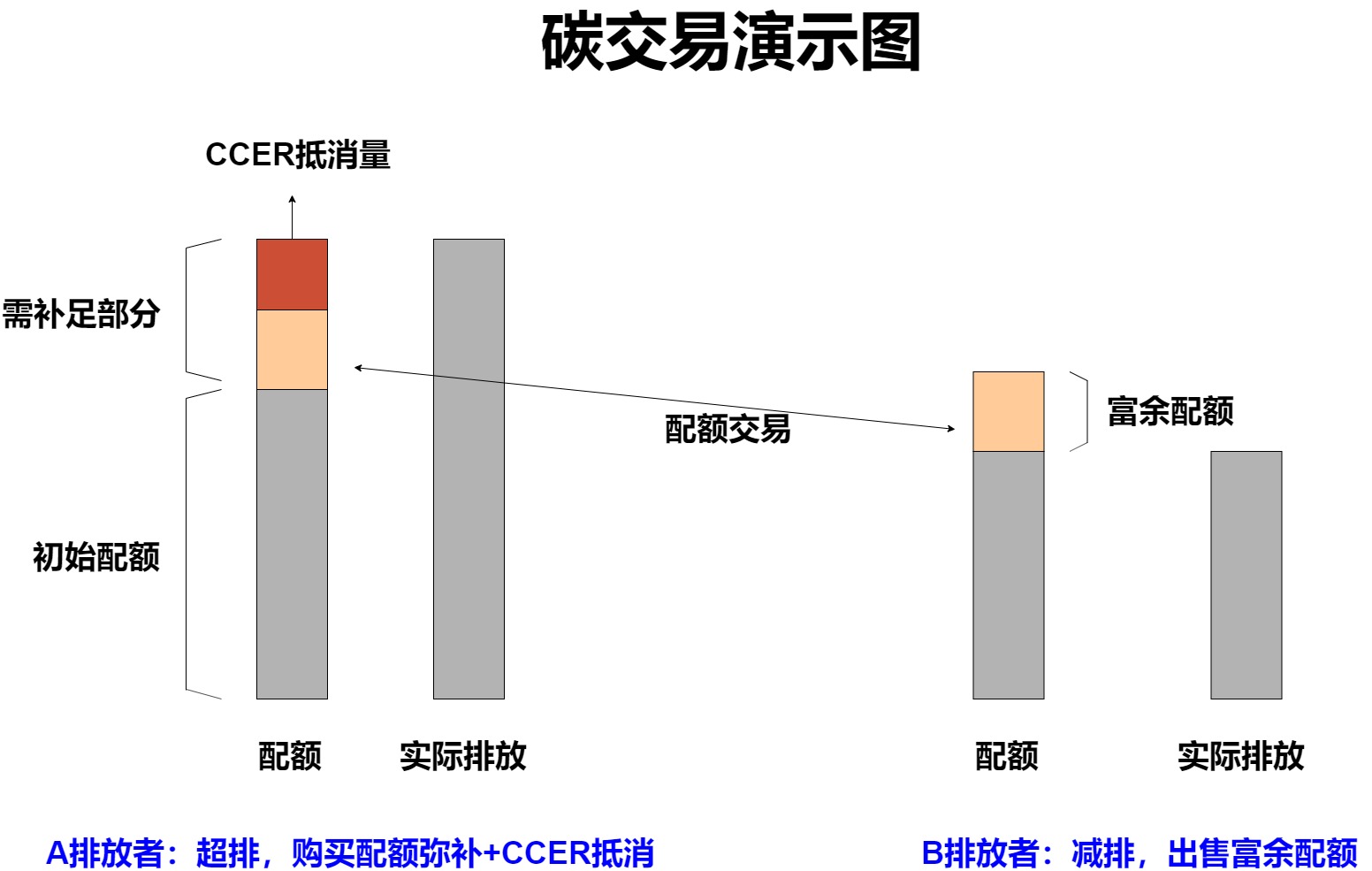 CCER同樣可用于企業(yè)碳排放抵減。參與碳交易市場的企業(yè),會(huì)有每年的排放配額,減排能力強(qiáng)的還可以申請自愿減排量(CCER),加入碳交易市場,則可以交易富裕的配額和CCER,相當(dāng)于是減排完成度差的企業(yè)向減排完成度好的企業(yè)進(jìn)行“經(jīng)濟(jì)補(bǔ)償”。