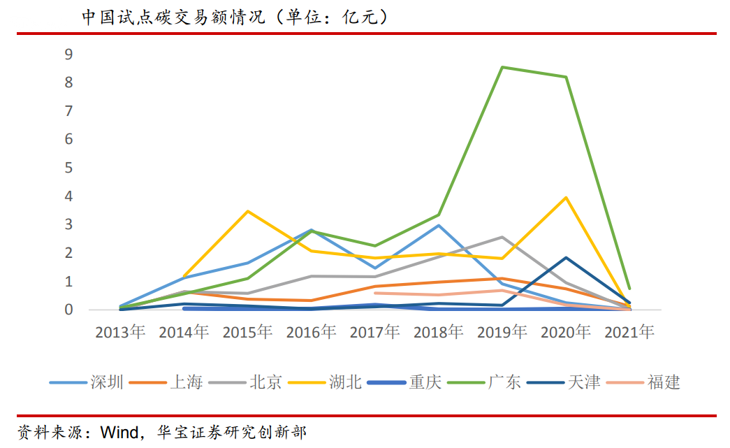 目前,全國共有8個(gè)地區(qū)在開展碳排放權(quán)交易試點(diǎn),包括:北京、天津、上海、重慶、湖北、廣東、深圳、福建。截至2020年11月,試點(diǎn)碳交易市場累計(jì)配額成交量約為4.3億噸CO?e,累計(jì)成交額近100億元人民幣。
