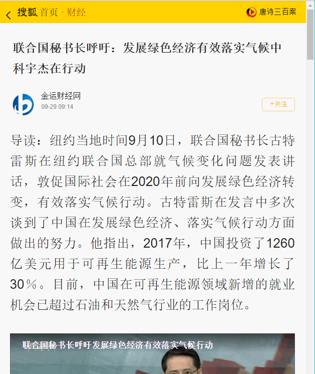 導讀:紐約當?shù)貢r間9月10日,聯(lián)合國秘書長古特雷斯在紐約聯(lián)合國總部就氣候變化問題發(fā)表講話,敦促國際社會在2020年前向發(fā)展綠色經(jīng)濟轉(zhuǎn)變,有效落實氣候行動。古特雷斯在發(fā)言中多次談到了中國在發(fā)展綠色經(jīng)濟、落實氣候行動方面做出的努力。他指出,2017年,中國投資了1260億美元用于可再生能源生產(chǎn),比上一年增長了30%。目前,中國在可再生能源領(lǐng)域新增的就業(yè)機會已超過石油和天然氣行業(yè)的工作崗位。