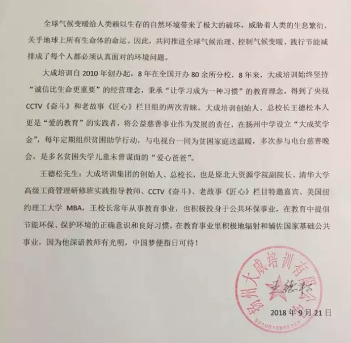 王德松先生:大成培訓集團的創(chuàng)始人、總校長,也是原北大資源學院副院長、清華大學高級工商管理研修班實踐指導教師、CCTV《奮斗》、老故事《匠心》欄目特邀嘉賓、美國紐約理工大學MBA。王校長常年從事教育事業(yè),也積極投身于公共環(huán)保事業(yè),他常常教導學生要注意節(jié)能環(huán)保、要保護我們生存環(huán)境。他在教育事業(yè)里積極地輻射和輔佐國家基礎(chǔ)公共事業(yè),因為他深諳教師有光明,中國夢便指日可待!